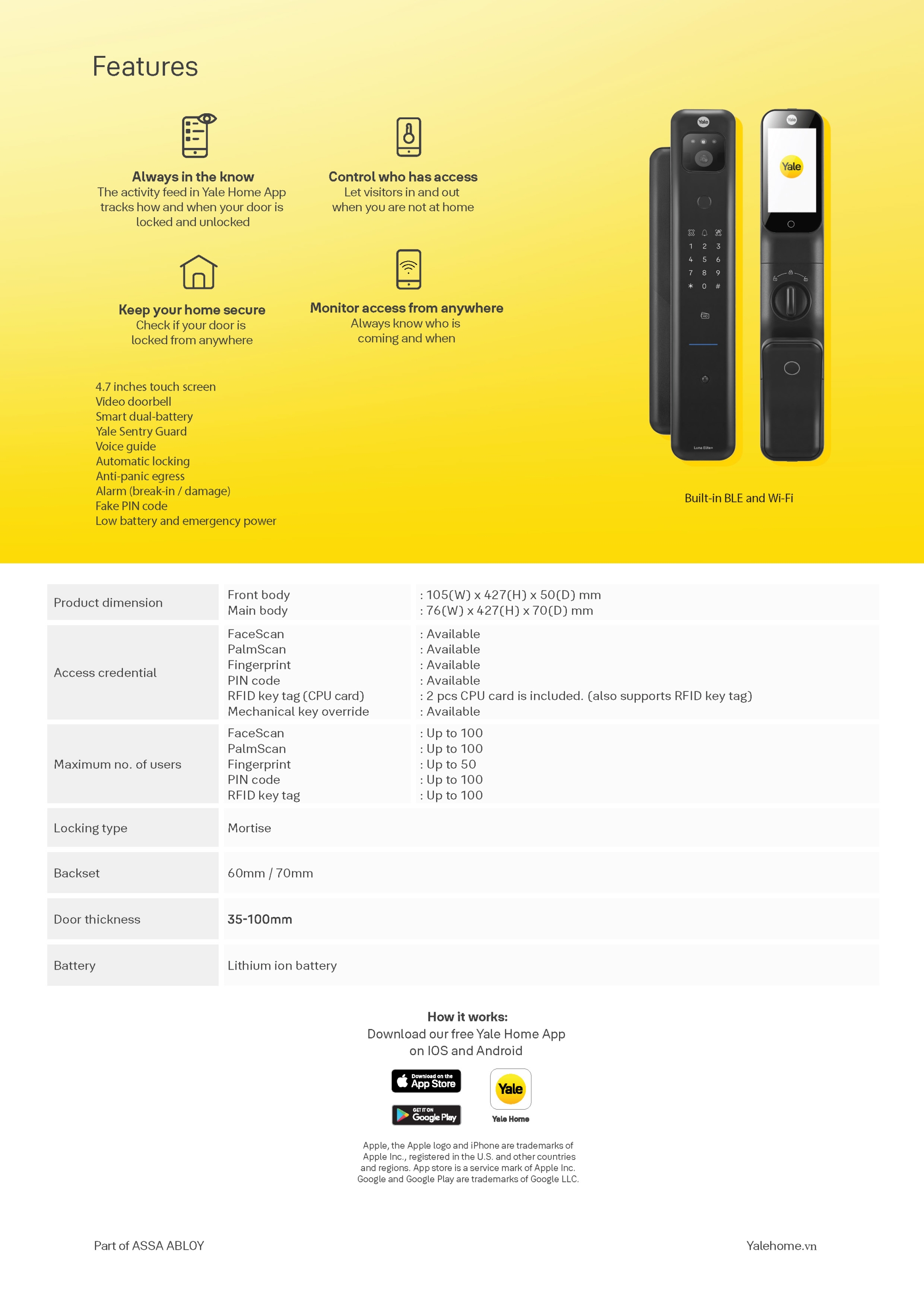 9. Bảng thông số kỹ thuật Khoá cửa khuôn mặt Yale Luna Elite+