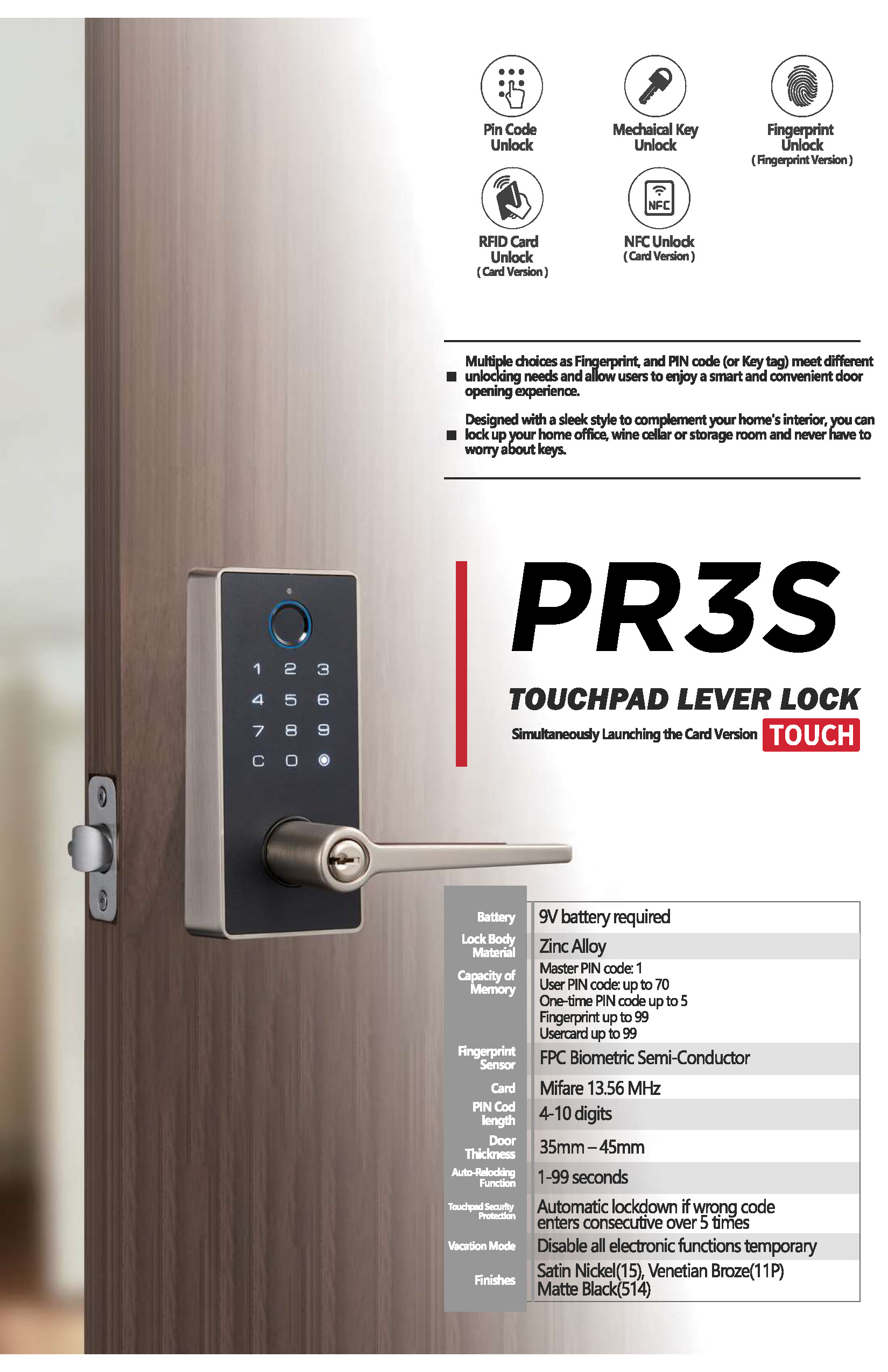 Kwikset PR3S là mẫu khoá điện tử cảm ứng cao cấp, tích hợp 5 phương thức mở khóa gồm: vân tay, mã PIN, thẻ từ RFID, NFC và chìa cơ dự phòng, đáp ứng mọi nhu cầu sử dụng hiện đại. Sản phẩm được thiết kế với chất liệu hợp kim kẽm bền bỉ, bề mặt phủ Satin Nickel, Venetian Bronze hoặc Matte Black sang trọng, phù hợp lắp đặt cho căn hộ, văn phòng, phòng lưu trữ hoặc nhà cho thuê.